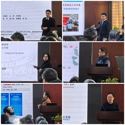 数学与教学中心党支部书记、数学系主任刘小川围绕“七个有力”,详细汇报了党支部通过强化党建引领,推动系所工作的发展的举措和成效。应用数学党支部书记祖建汇报了支部作为全国高校党建工作样板支部,在党支部建设促进系所中心工作发展方面的特色做法和取得的成绩。计算数学师生联合党支部书记王亚婷汇报了支部成立以来,在政治理论学习、团结凝聚师生、推动系所发展等方面的工作进展和取得的成效。信息科学党支部书记李慧斌全面总结了支部建设成果,充分展现出党支部的战斗堡垒作用和党员先锋模范作用。统计师生联合党支部书记张春霞介绍了推动党建和业务深度融合的特色做法,如“师生共读一本书”、学科师生座谈会等,对促进支部发展取得了显著成效。行政与实验党支部书记罗文成汇报了支部通过构建全方位、多层次、综合性的行政服务体系和实验辅助体系,助推学院各项事业高质量发展的举措和成效。